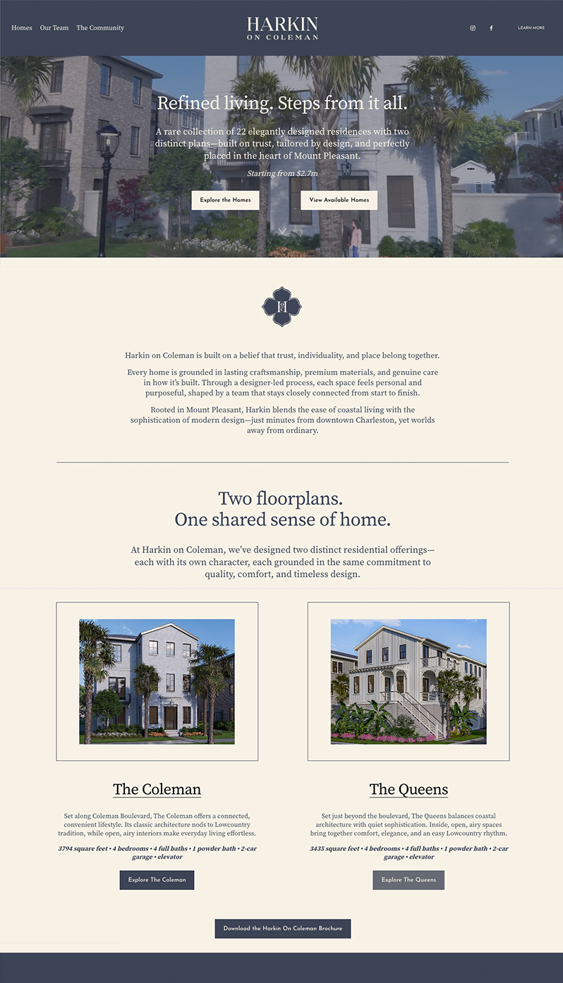 Harkin on Coleman is a boutique 22-residence community in Mount Pleasant, SC. The project balances modern living with timeless detail—elevated, intentional, and deeply rooted in place.